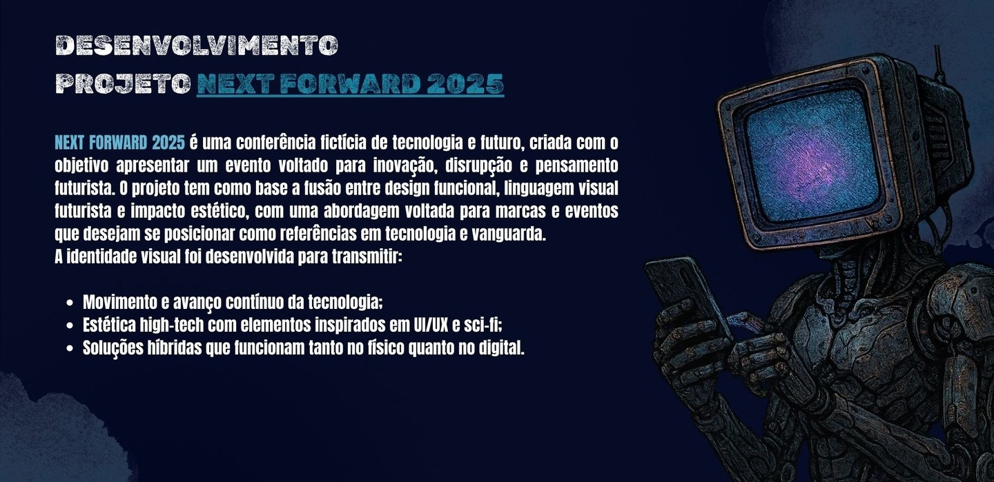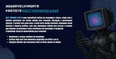 A tipografia foi escolhida para reforçar o conceito futurista do evento, priorizando uma estética tecnológica, robusta e contemporânea. A fonte utilizada contribui diretamente para a construção da identidade visual das peças, transmitindo inovação, força e dinamismo, ao mesmo tempo em que garante boa leitura em diferentes formatos e mídias digitais.